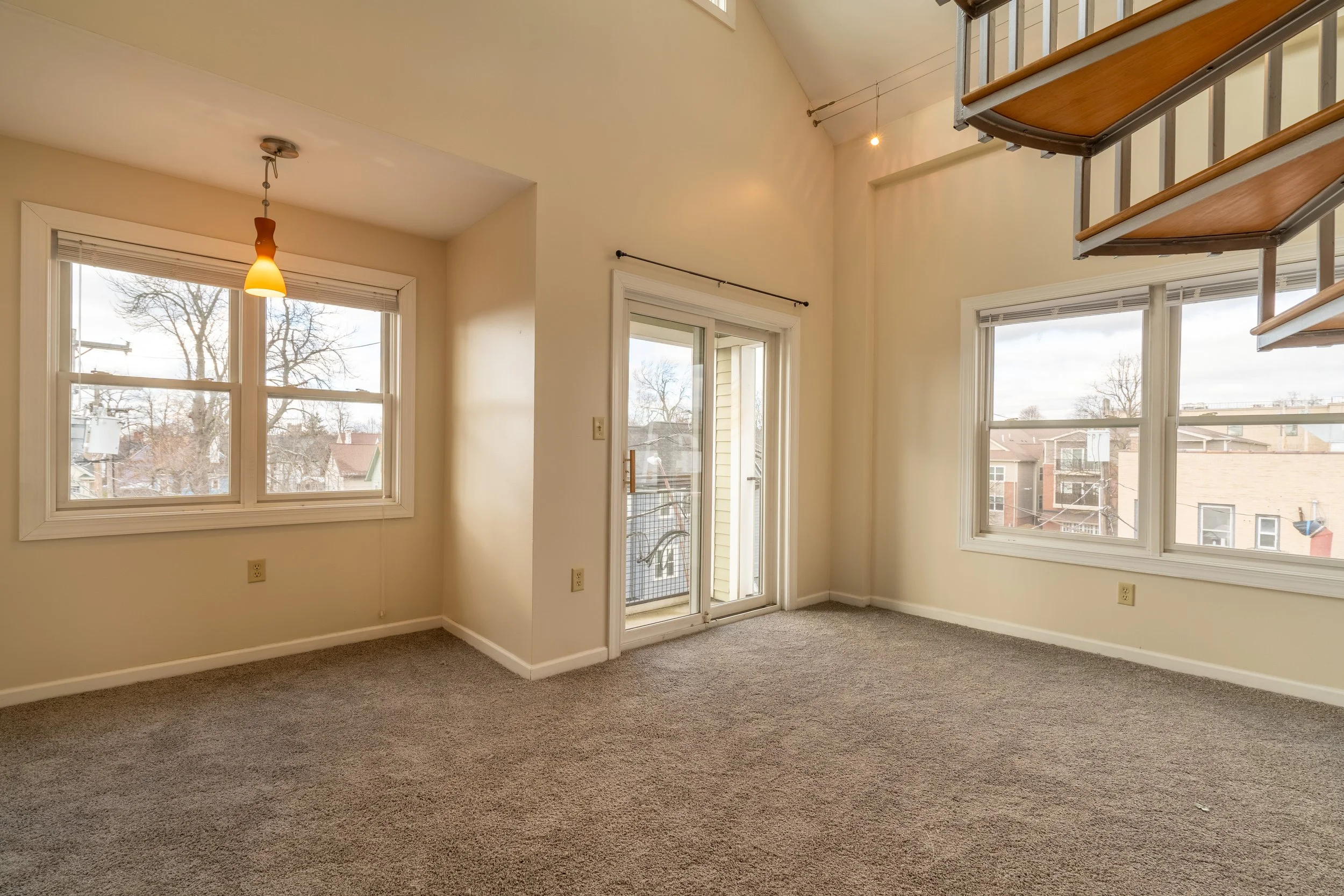 High ceilings with large window openings, including two-story living areas in lofts units